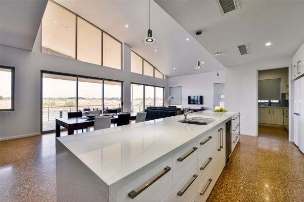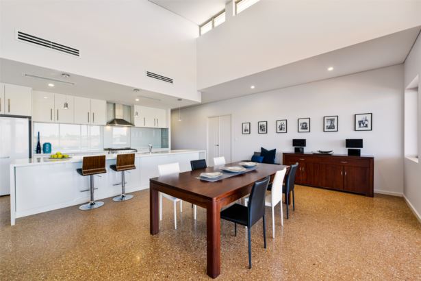 As you first enter from the front portico, the long hallway immediately gives you a glimpse of the sparkling waters ahead and draws you to front of the house, to a large, airy and open plan living and dining area. The natural colour tones of the polished concrete flooring throughout the home provide both simple beauty and practicality for living in the North-West.